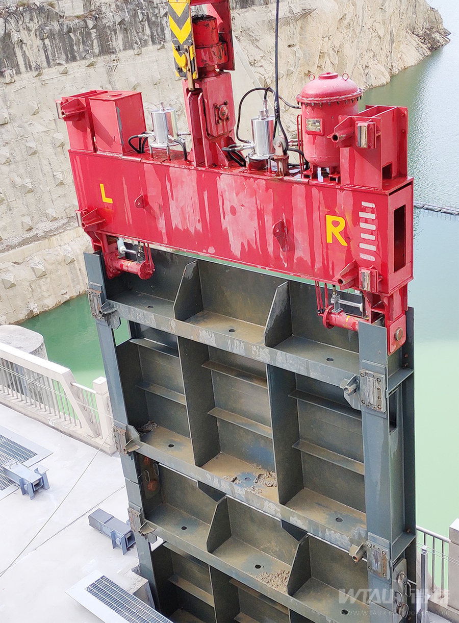 這次改造的進(jìn)水口兩臺3200kN/650kN門機(jī),主鉤用于提落機(jī)組檢修門,回轉(zhuǎn)吊用于提落攔污柵、疊梁門。由于每年需要進(jìn)行一次攔污柵清理,兩次疊梁門提落,回轉(zhuǎn)吊使用頻率高。回轉(zhuǎn)吊水下抓梁工作深度較深,使用過程中無法直接獲取水下抓梁就位及穿脫銷情況,水下存在異物時(shí)操作風(fēng)險(xiǎn)較大。