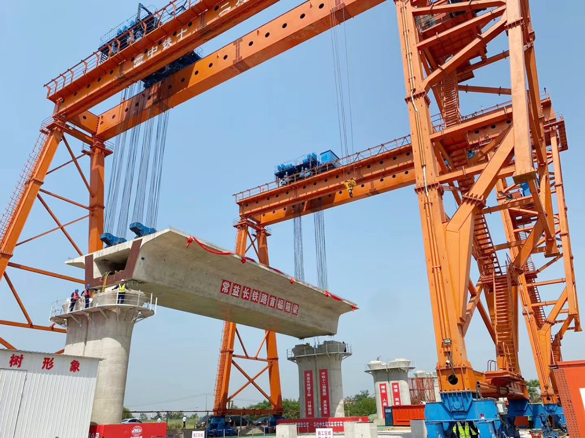 初夏的沅江之畔暖陽和煦,全長32.6米、重達828噸的箱梁“平躺”在兩臺重型提梁機之間,等待架梁指令。常德市、漢壽縣及縣直單位、鄉(xiāng)鎮(zhèn)、建設單位代表共同見證了這一歷史時刻。隨著參建代表共同啟動架梁按鈕,常益長鐵路首榀箱梁被鋼絞索緩緩提起,不到5分鐘就被穩(wěn)穩(wěn)安放在9.5米高的橋墩承臺上,現(xiàn)場霎時間掌聲雷動。
