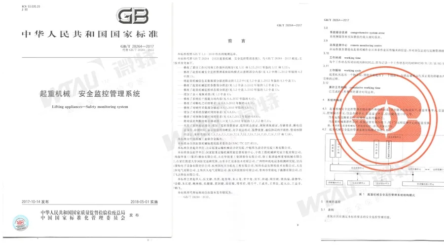根據(jù)2010年7月國(guó)務(wù)院就提出強(qiáng)制推行大型起重機(jī)安裝監(jiān)控管理系統(tǒng)的通知。2012年7月中華人民共和國(guó)國(guó)家質(zhì)量監(jiān)督檢驗(yàn)檢疫總局、中國(guó)國(guó)家標(biāo)準(zhǔn)化管理委員會(huì)發(fā)布GB/T 28264-2012《起重機(jī)械 安全監(jiān)控管理系統(tǒng)》。
