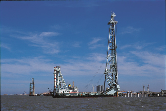 “三航樁108”于2009年7月建造完成并投入使用,總長71.7米,型寬27米,型深5.2米,樁架高108米, 是當時國內(nèi)最高的打樁船。最大沉樁樁徑可達3米,最大吊重2×120噸,適用于大型跨海橋梁和深水港口大直徑打樁施工使用。