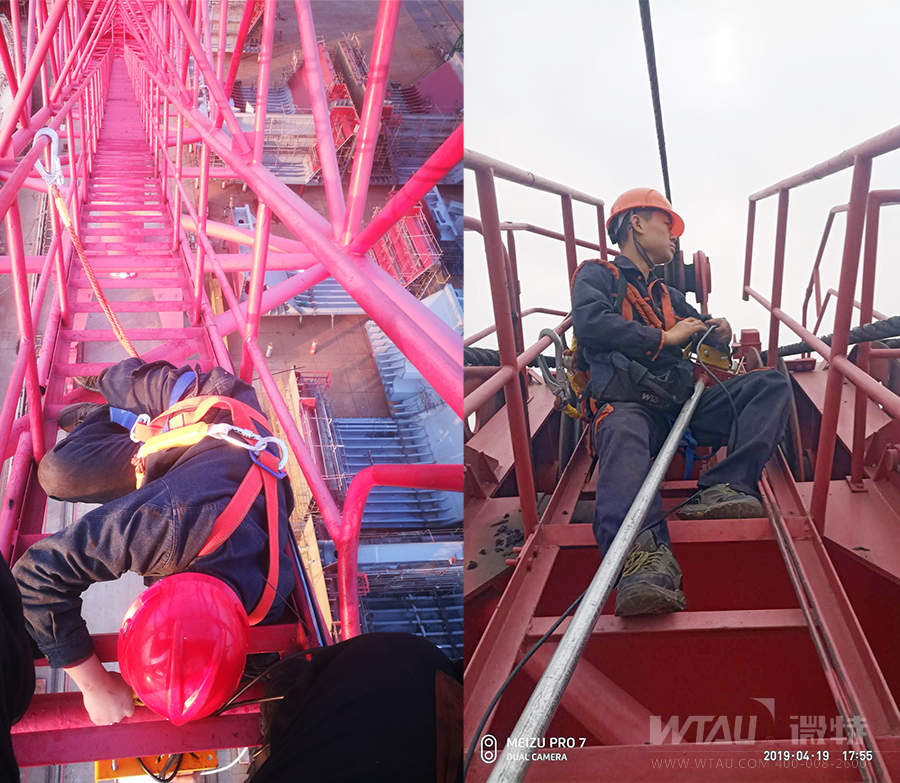 港口門座式起重機(jī),對船臺上的小物品吊裝以及上下貨物也起著至關(guān)重要的作用!港口門座機(jī)高度高,沒有電梯,只能徒手多趟搬運(yùn).面對特檢要求的力矩吊點(diǎn)區(qū)域的全方位覆蓋要求,微特人員運(yùn)用熟練的經(jīng)驗(yàn)以專業(yè)的技能爬到高60米長60米的臂桿根部,將球機(jī)攝像頭固定在上面,使得吊點(diǎn)區(qū)域全方位無死角都能覆蓋到。