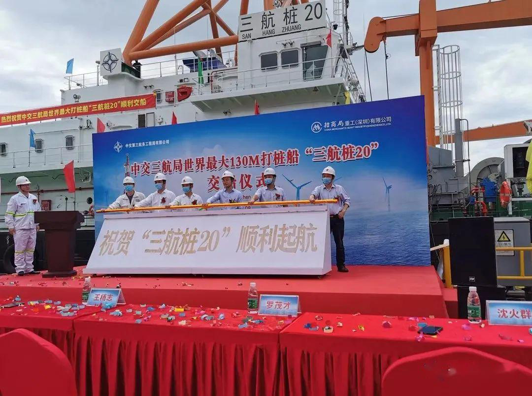 2020年5月8日上午,由招商局重工(深圳)有限公司為中交三航局建造的130M打樁船“三航樁20”在招商工業(yè)深圳孖洲島基地舉行了交船儀式,標(biāo)志著目前世界最大的打樁船正式誕生。中交三航局副總經(jīng)理尹建兵、中國(guó)船級(jí)社深圳分社總經(jīng)理羅茂才、招商局重工(深圳)有限公司總經(jīng)理王楊志及有關(guān)負(fù)責(zé)人出席了交船儀式。