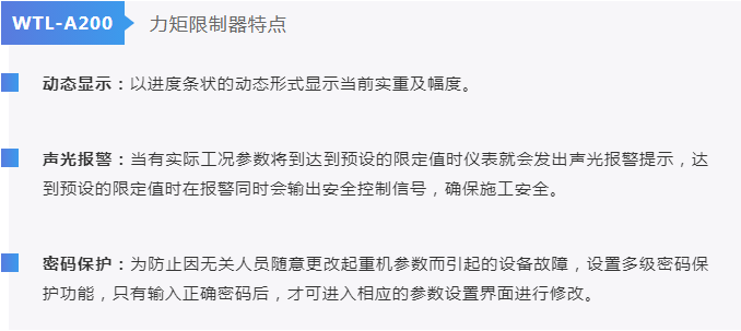 經(jīng)過工程師現(xiàn)場調(diào)研與多次溝通,最終選用了WTL-A200型力矩限制器,該力矩限制器擁有性價比高、運行穩(wěn)定、通用性強等特點,已廣泛運用于各力矩起重機上,備受客戶好評。