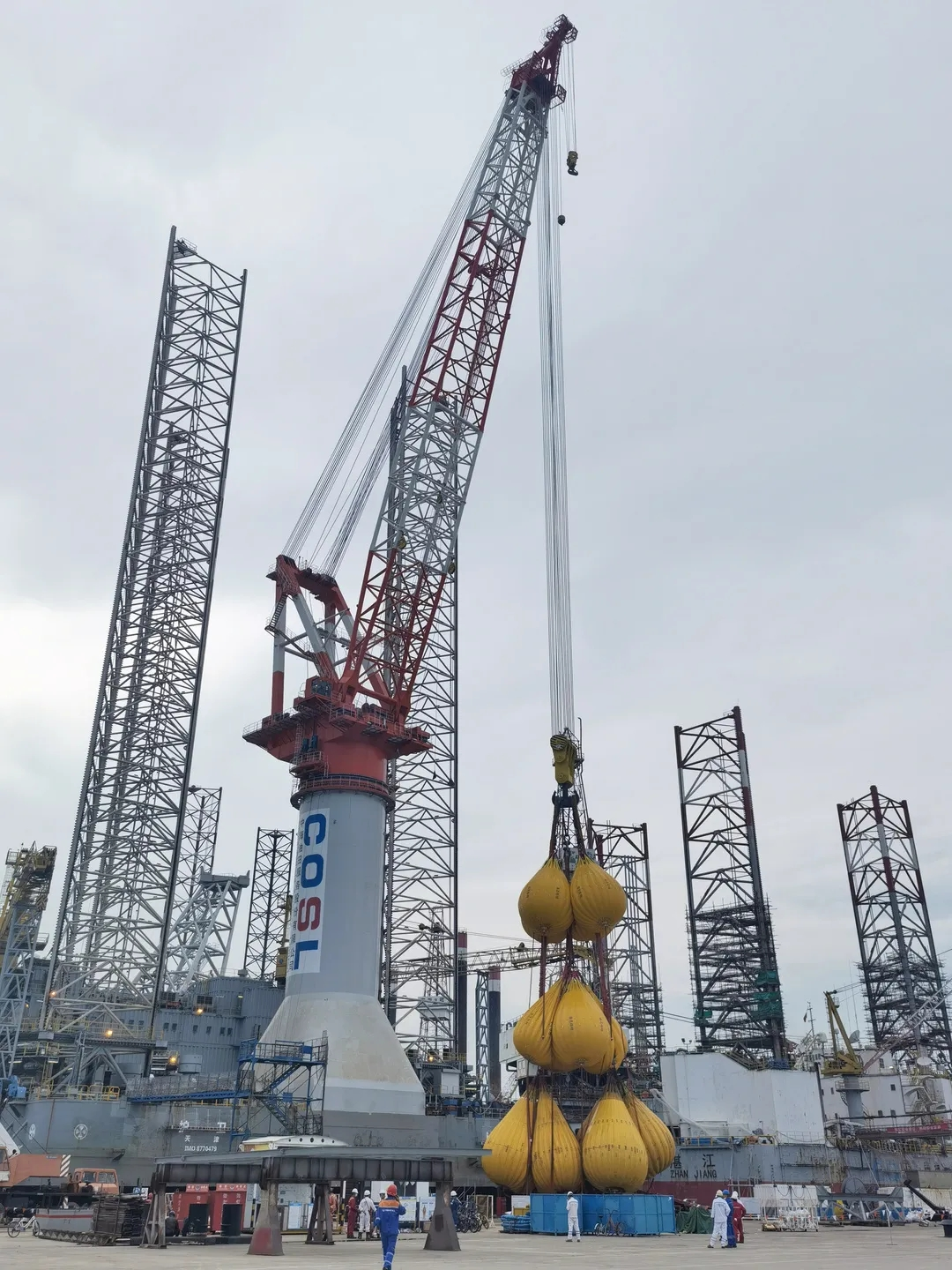 裝備自重840T,吊臂長達76米,定點吊最大安全工作負荷800T,全回轉(zhuǎn)吊最大安全工作負荷650T。設(shè)備吊臂上配備了一個800T主鉤,一個120T副鉤,其中主鉤最大起升高度為甲板面上105米,副鉤最大起升高度甲板面以上113米,能滿足風(fēng)電塔筒、扇葉、電機的安裝需求。