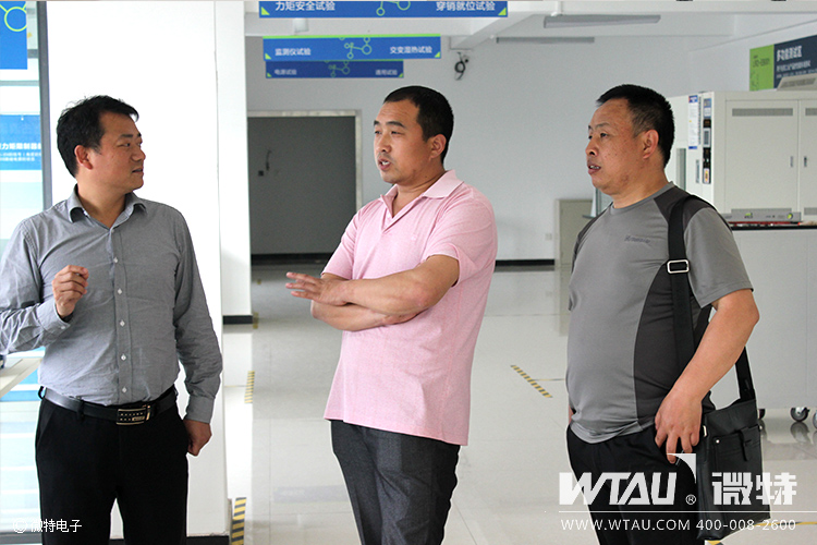 微特電子總經(jīng)理聶道靜對兩位遠道而來的貴客表示歡迎,微特水電事業(yè)部經(jīng)理韓信與技術(shù)工程師劉普文向郭永崗、田國強詳細介紹了微特電子的發(fā)展歷程及產(chǎn)品技術(shù)。同時還一同來到微特建設(shè)的智能吊裝設(shè)備研發(fā)檢測中心,參觀高溫老化實驗機、雷擊浪涌、靜電測試、振動實驗等實驗檢測設(shè)備。這些實驗設(shè)備是微特電子高品質(zhì)產(chǎn)品的保證,確保每一臺出廠的設(shè)備都是百分百合格。