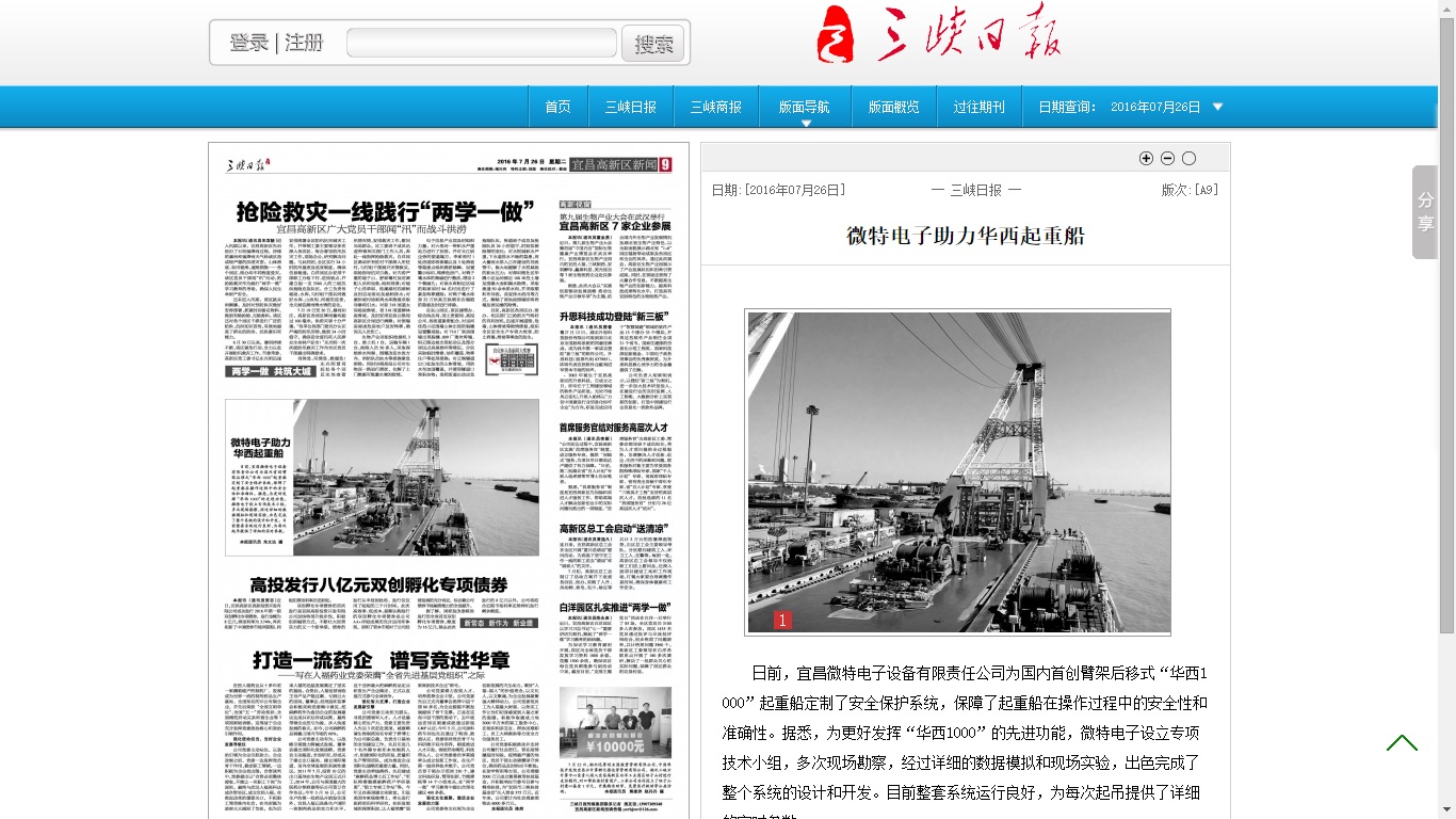 7月26日,三峽日?qǐng)?bào)A9版刊登了題為《微特電子助力華西起重船》的圖文消息。文中介紹了我司為國內(nèi)首創(chuàng)臂架后移式“華西1000”起重船定制了安全保護(hù)系統(tǒng)的基本情況。