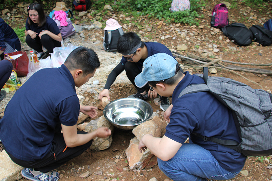 經(jīng)過半天的登山式行軍,中午,我們來到山谷中一處較平坦地地方,各隊開始分工埋鍋造飯,相互配合做中餐。