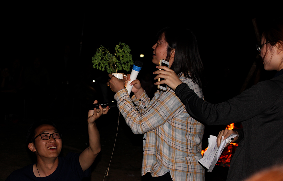 晚會最后,各隊拿出各自行軍過程中尋得的寶物,在這里微特公司首次愛心拍賣會溫情上演。(上圖為Supreme隊持寶人正在講解她所持的盆栽寶貝,左右兩邊的隊員正在為寶貝打燈光)