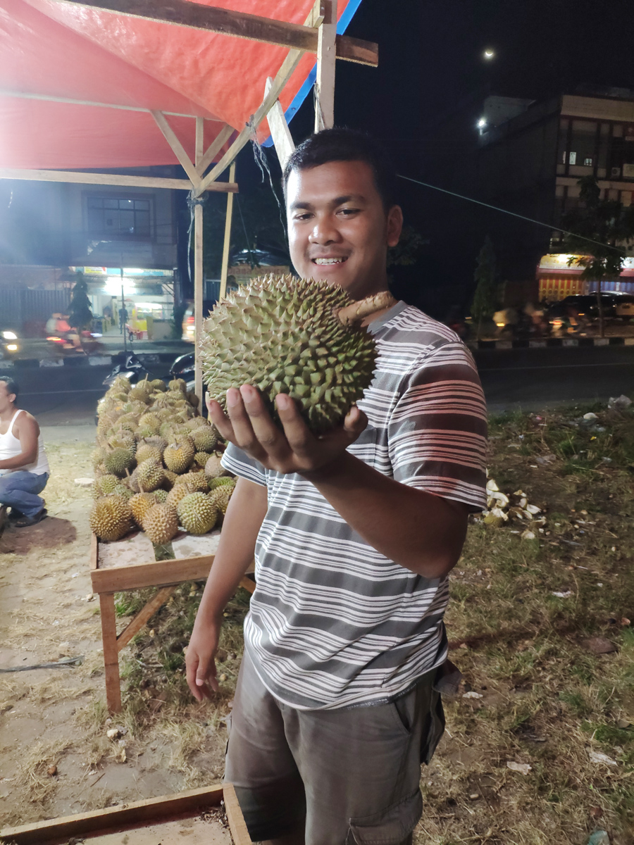 因?yàn)槊尢m與北干巴魯同在蘇門答臘島,棉蘭的小榴蓮在北干特別便宜,只需15000(約7.5人民幣)印尼盧比,就能飽飽吃上一整個榴蓮,是不是很劃算呢?吃完了榴蓮,味道太大怎么辦?往榴蓮殼里倒上水,等上三五分鐘,喝下去,消火去味兒,這可是當(dāng)?shù)厝瞬惠p易告知的絕技呢。