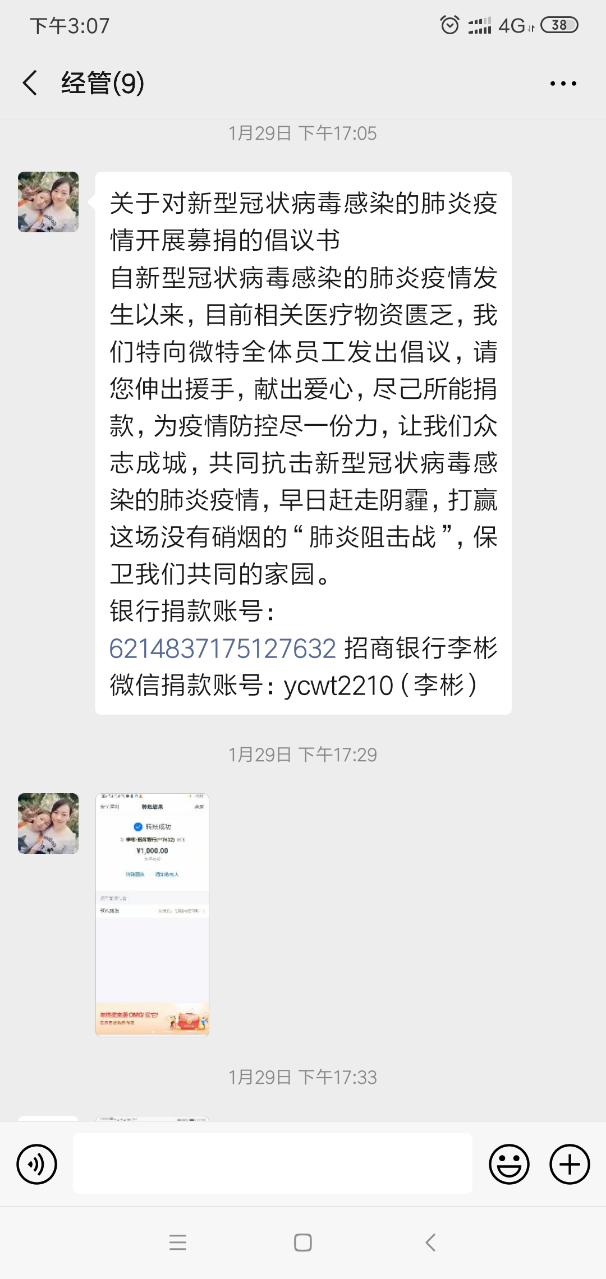 1月29日,微特在公司內(nèi)部微信群發(fā)起《募捐倡議書》,假期中的各地員工紛紛響應(yīng)慷慨解囊,獻(xiàn)出愛心。