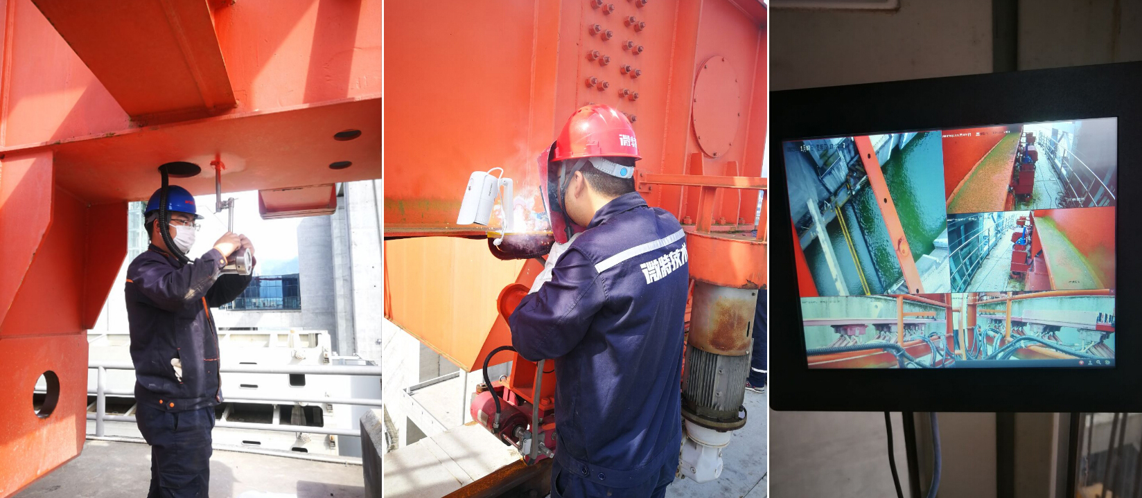 現(xiàn)場(chǎng)復(fù)工后,微特技術(shù)項(xiàng)目組正式投入井然有序的施工中,本項(xiàng)目施工主要包括上閘首500T橋機(jī)和300T橋機(jī)、下閘首160T橋機(jī)電纜卷筒控制方式、抓梁穿、退銷(xiāo)應(yīng)急回路、應(yīng)急泵站一體化改造、增加視頻圖像監(jiān)控、橋機(jī)潤(rùn)滑系統(tǒng)改造、橋機(jī)滑觸線(xiàn)更換、軌道檢測(cè)等。