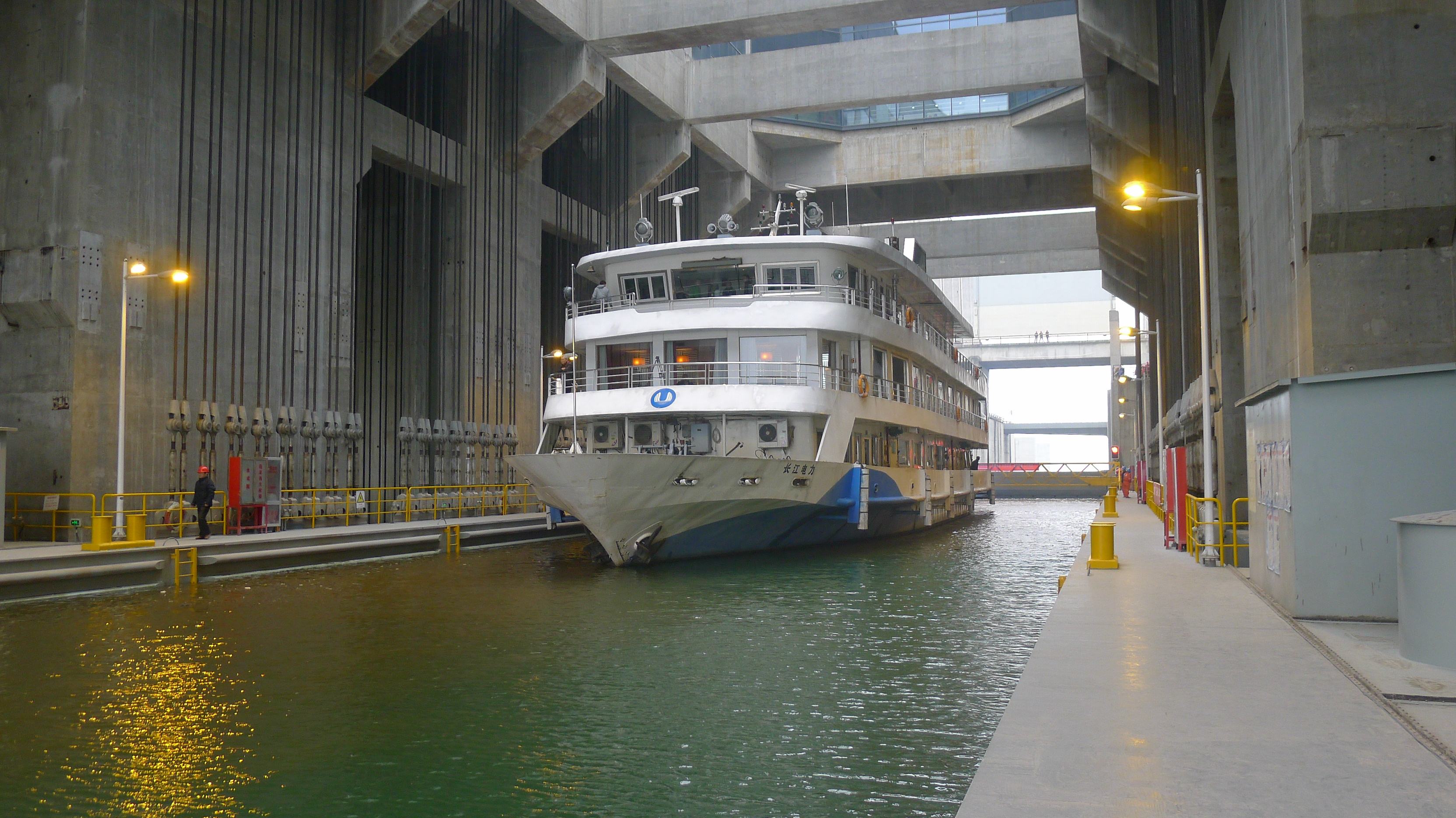 船舶如果要順暢往返于上下游,就必須通過(guò)三峽樞紐工程的雙線(xiàn)五級(jí)梯級(jí)船閘或垂直升船機(jī)。