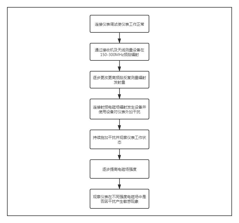 實(shí)驗(yàn)在相關(guān)機(jī)構(gòu)實(shí)驗(yàn)室屏蔽暗室中進(jìn)行,先對(duì)儀表進(jìn)行調(diào)試,使儀表處于正常穩(wěn)定的工作狀態(tài),然后再通過(guò)實(shí)驗(yàn)設(shè)備模擬各類(lèi)干擾,察看儀表的工作狀態(tài),檢查儀表的各類(lèi)工作指標(biāo)。