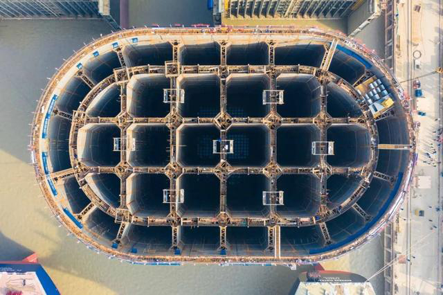 5號(hào)、6號(hào)墩鋼沉井每個(gè)用鋼量達(dá)1.8萬噸,沉井底面長95米,寬57.8米,總高72米,為世界在建最大水上沉井基礎(chǔ) 。