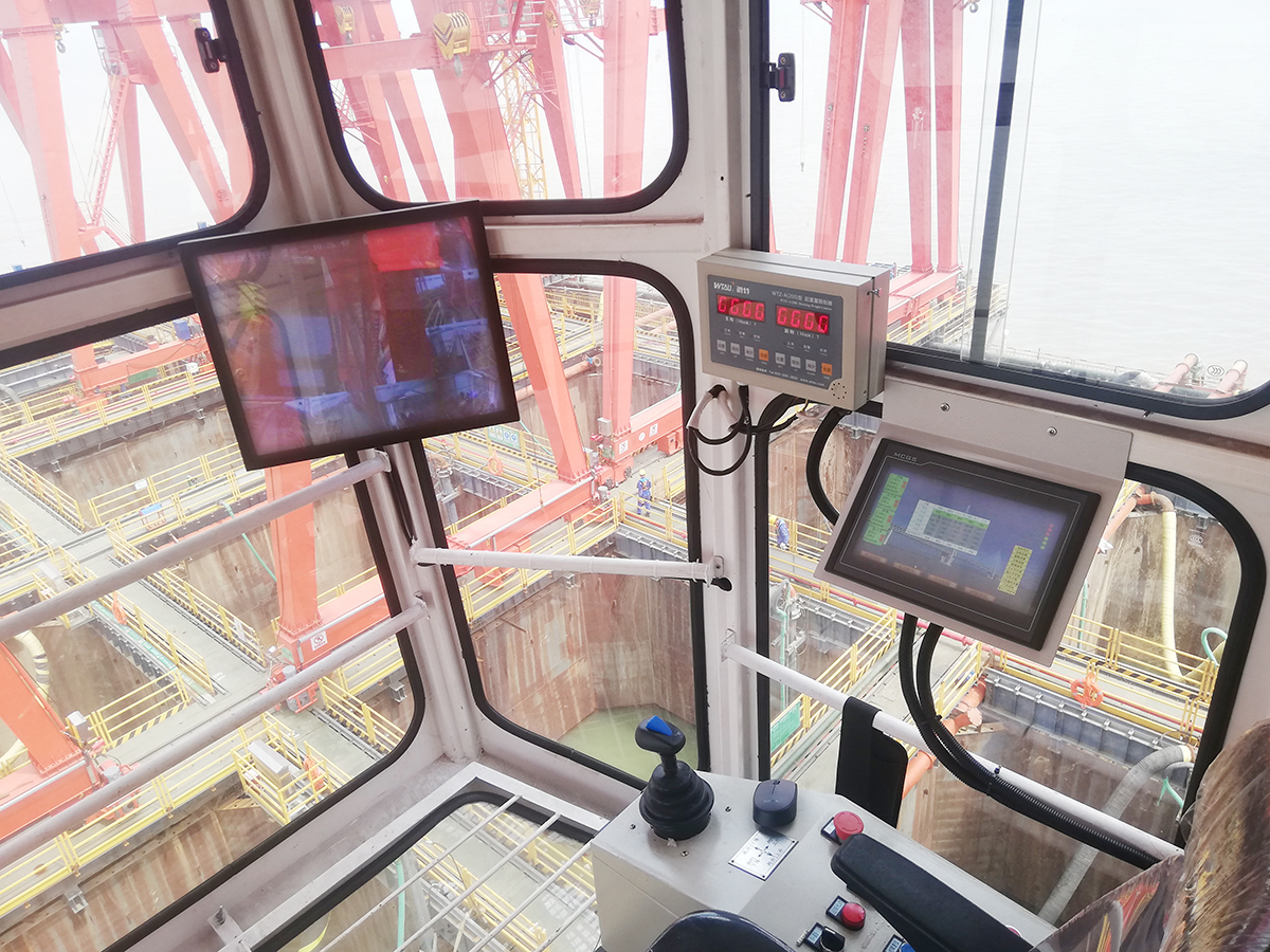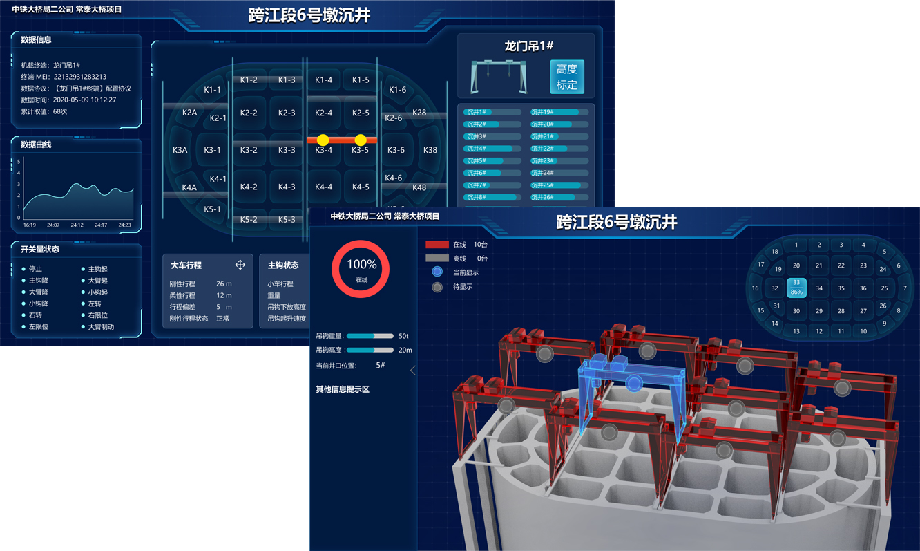 微特今年下半年與項(xiàng)目部多次溝通,與總工反復(fù)進(jìn)行技術(shù)協(xié)商及推演,最終決定使用龍門吊來監(jiān)測泥面高度,通過三維定位龍門吊的方案,找到每個(gè)龍門吊在沉井上的坐標(biāo),再結(jié)合卷揚(yáng)機(jī)的高度變化,來實(shí)現(xiàn)每日單天每個(gè)井孔的最大深度測量,達(dá)到自動(dòng)測量自動(dòng)生產(chǎn)數(shù)據(jù)報(bào)表功能,使得沉井下沉高度自動(dòng)可視可測。
