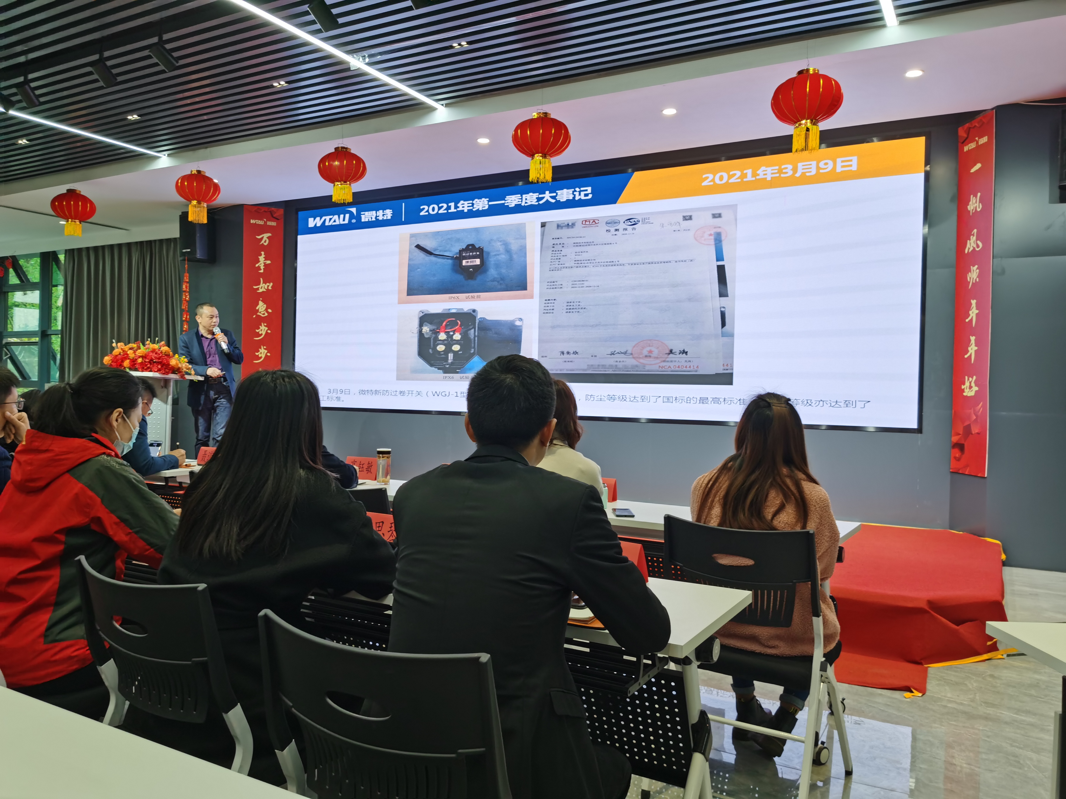 會(huì)議開始,輪值CEO李彬?qū)Φ谝患径冗M(jìn)行了總結(jié)回顧,季度伊始聶董發(fā)表了“感恩有你攜手同行,牢記使命整裝再發(fā)”的2021年新年致辭,隨后在所有同仁的見證下湖北傳感物聯(lián)產(chǎn)業(yè)技術(shù)研究院揭牌儀式成功舉辦,同時(shí)微特度過了19歲生日。聶董作為人大代表參加了湖北省第十三屆人民代表大會(huì)第五次會(huì)議的系列會(huì)議,輪值CEO李彬被授予“宜昌市優(yōu)秀青年科技工作者”稱號(hào),微特智慧谷總經(jīng)理郭麗麗榮獲宜昌市“杰出創(chuàng)業(yè)女性”榮譽(yù)稱號(hào)。這一季度微特參與三項(xiàng)世界第一的常泰長(zhǎng)江大橋建設(shè),新防過卷開關(guān)(WGJ-1型)通過IP66防護(hù)等級(jí)認(rèn)證,海工、船舶、水電、訂單保障中心、研發(fā)中心、經(jīng)營(yíng)管理部、孵化器等各部門都取得了優(yōu)異的工作成果。