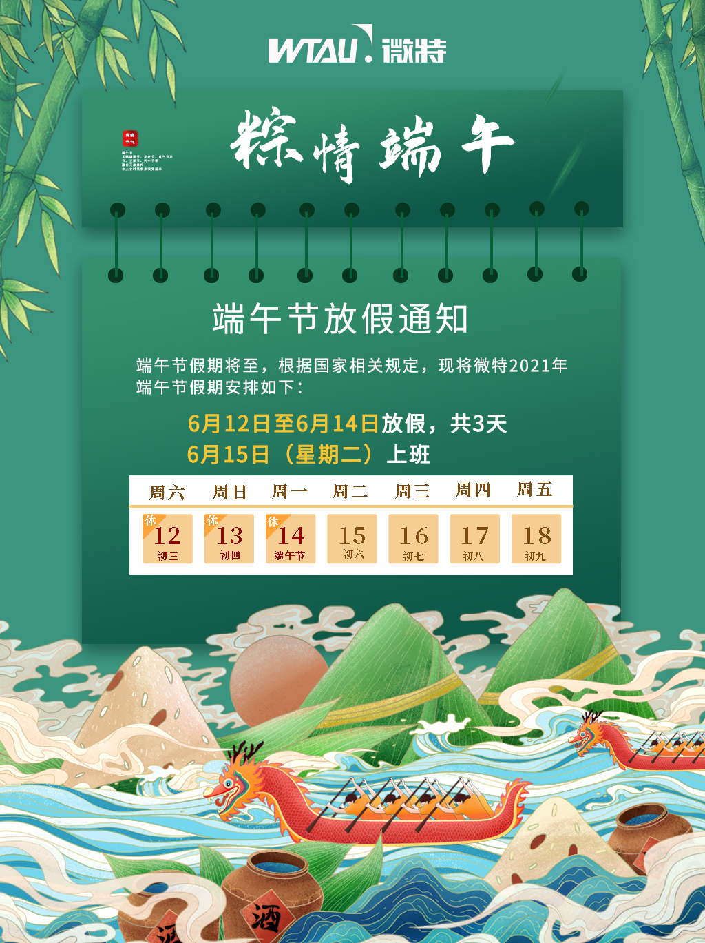粽香送祝福,情暖端午節(jié)!值此端午節(jié)來臨之際,根據(jù)國務(wù)院辦公廳通知精神,并結(jié)合微特公司實際情況,現(xiàn)將2021年端午節(jié)放假安排通知如下: