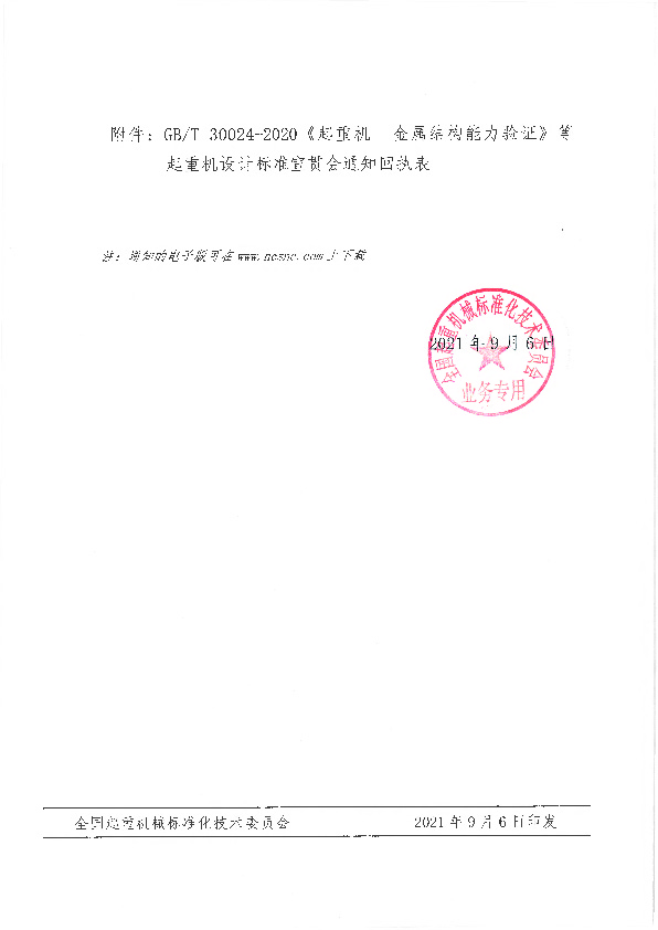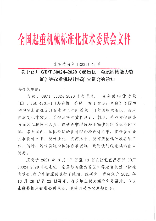 原定于2021年8月18日至19日在宜昌召開的全國起重機械標準化技術(shù)委員會組織的關(guān)于GB/T 30024-2020《起重機 金屬結(jié)構(gòu)能力驗證》等起重機設(shè)計標準宣貫會,由于疫情原因進行了延期。經(jīng)組委會研究決定將于2021年10月20日至22日仍在宜昌召開此次會議。