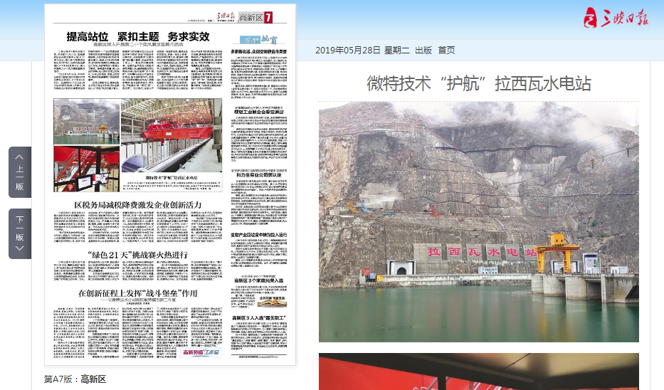 2019年5月28日,三峽日報第A7版高新區(qū)專欄刊等圖文消息:微特技術(shù)“護航”拉西瓦水電站。