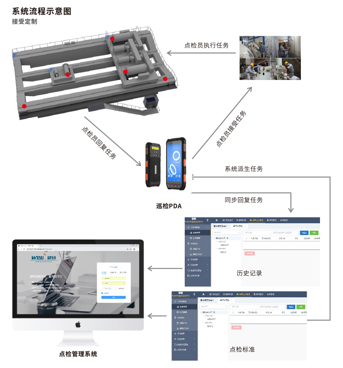 WT-SMS-v2.0設(shè)備點(diǎn)檢系統(tǒng)是結(jié)合鋼廠起重機(jī)實(shí)際生產(chǎn)點(diǎn)檢標(biāo)準(zhǔn)及管理積累經(jīng)驗(yàn),設(shè)計(jì)生產(chǎn)的一款產(chǎn)品。