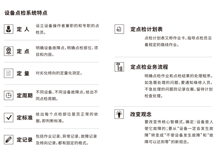 點(diǎn)檢是車間設(shè)備管理的一項(xiàng)基本制度,目的是通過點(diǎn)檢準(zhǔn)確掌握設(shè)備技術(shù)狀況,維持和改善設(shè)備工作性能,預(yù)防事故發(fā)生,減少停機(jī)時(shí)間,延長設(shè)備壽命,降低維修費(fèi)用,保證正常生產(chǎn)。