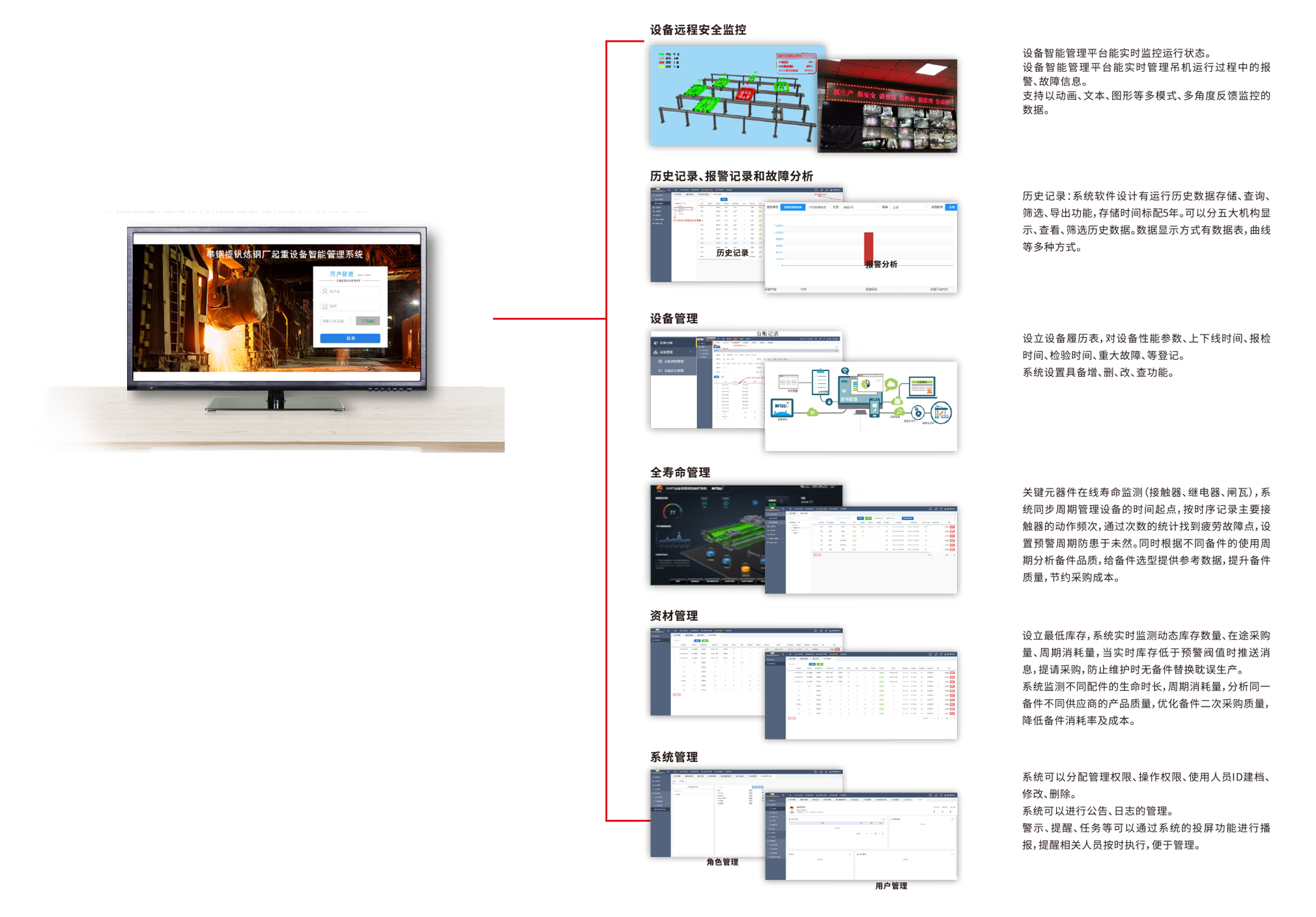 WTCIMS-V2.0系統(tǒng)針對起重機(jī)運行設(shè)計了設(shè)備基礎(chǔ)信息、設(shè)備運行管理、日狀態(tài)監(jiān)控、資材管理、系統(tǒng)管理五大功能模塊,解決起重機(jī)實時狀態(tài)監(jiān)測、資料歸檔、點檢維護(hù)保養(yǎng)、備件周期、隱患趨勢預(yù)測等全壽命周期的全過程閉環(huán)管理。