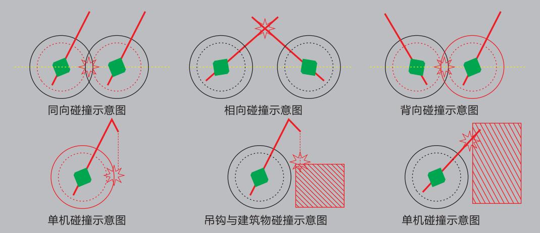 區(qū)域主動(dòng)防碰撞系統(tǒng): 通過雷達(dá)主動(dòng)監(jiān)測起重機(jī)易碰運(yùn)動(dòng)部位路徑,探測區(qū)域空間內(nèi)是否有障礙物,以此來避免吊機(jī)與吊機(jī)間,回轉(zhuǎn)部位與其它物體、臂架與周邊物體之間的區(qū)域空間是否安全,在安全區(qū)被入侵時(shí)發(fā)出聲、光報(bào)警,甚至給出止??刂菩盘?,實(shí)現(xiàn)主動(dòng)防碰撞監(jiān)測保障設(shè)備安全。