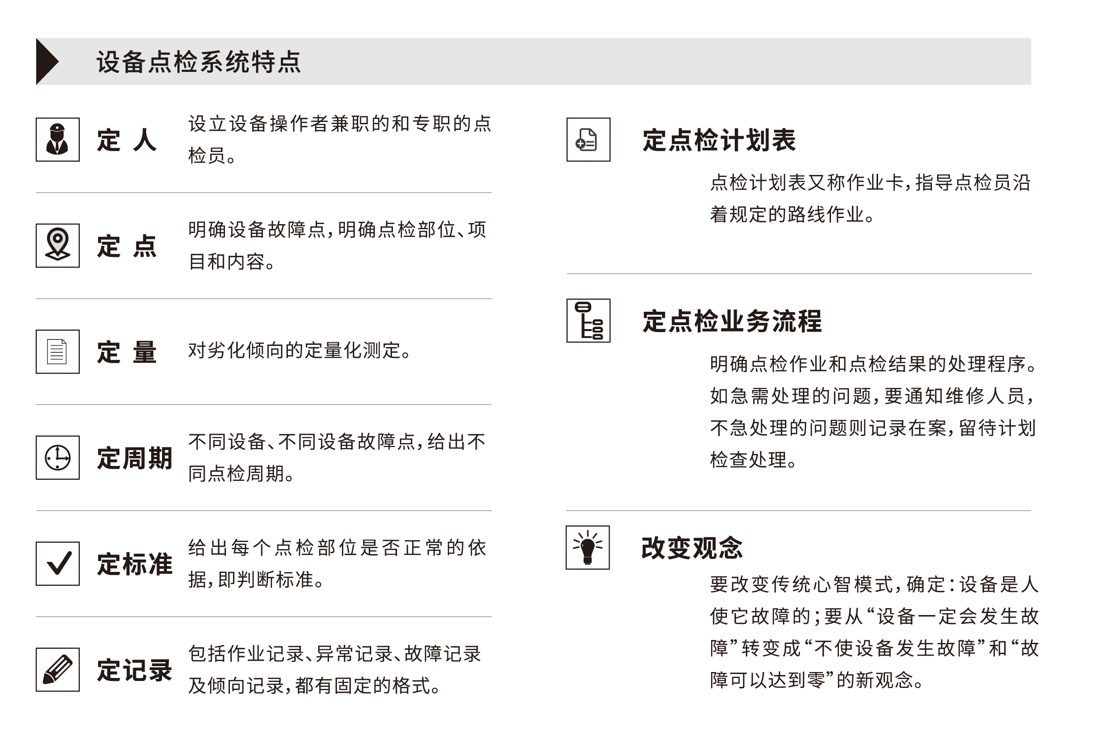 點(diǎn)檢是車間設(shè)備管理的一項(xiàng)基本制度,目的是通過點(diǎn)檢準(zhǔn)確掌握設(shè)備技術(shù)狀況,維持和改善設(shè)備工作性能,預(yù)防事 故發(fā)生,減少停機(jī)時(shí)間,延長設(shè)備壽命,降低維修費(fèi)用,保證正常生產(chǎn)。