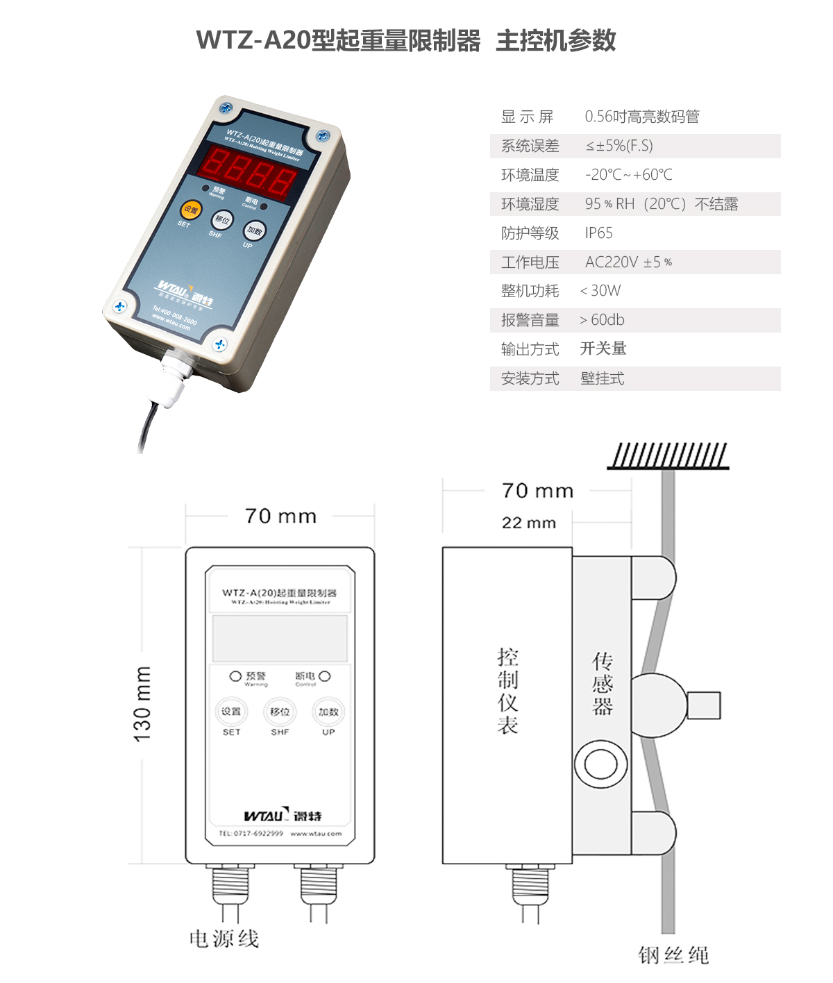 WTZ-A20起重量限制器用于一路重量信號監(jiān)測,適用于升降機、電動葫蘆等鋼絲繩置吊的起重設(shè)備。該型號儀表可替換WTZ-A50、WTZ-A60起重量限制器使用。