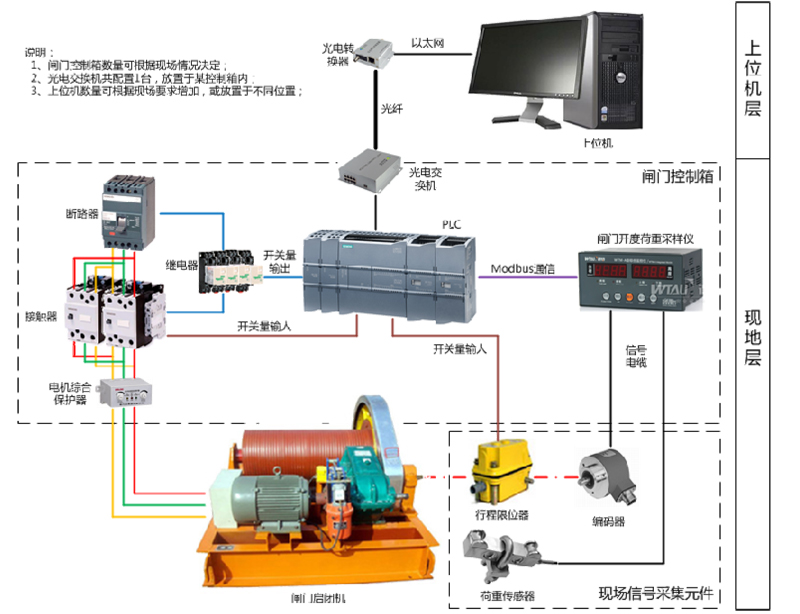 控制系統(tǒng)采用分層分布式結(jié)構(gòu),整個系統(tǒng)分為兩層,上層為中控室監(jiān)控單元、下層為現(xiàn)地操作單元。實現(xiàn)對所有閘門的監(jiān)視、控制;現(xiàn)地層以PLC為主控元件實現(xiàn)控制。根據(jù)閘門數(shù)量配置控制箱,每扇閘門各配置1臺控制箱,放置于被控閘門啟閉機(jī)旁。既可在上位機(jī)實現(xiàn)對閘門的遠(yuǎn)程監(jiān)控,亦可通過控制箱上的按鈕對閘門進(jìn)行現(xiàn)地操作。