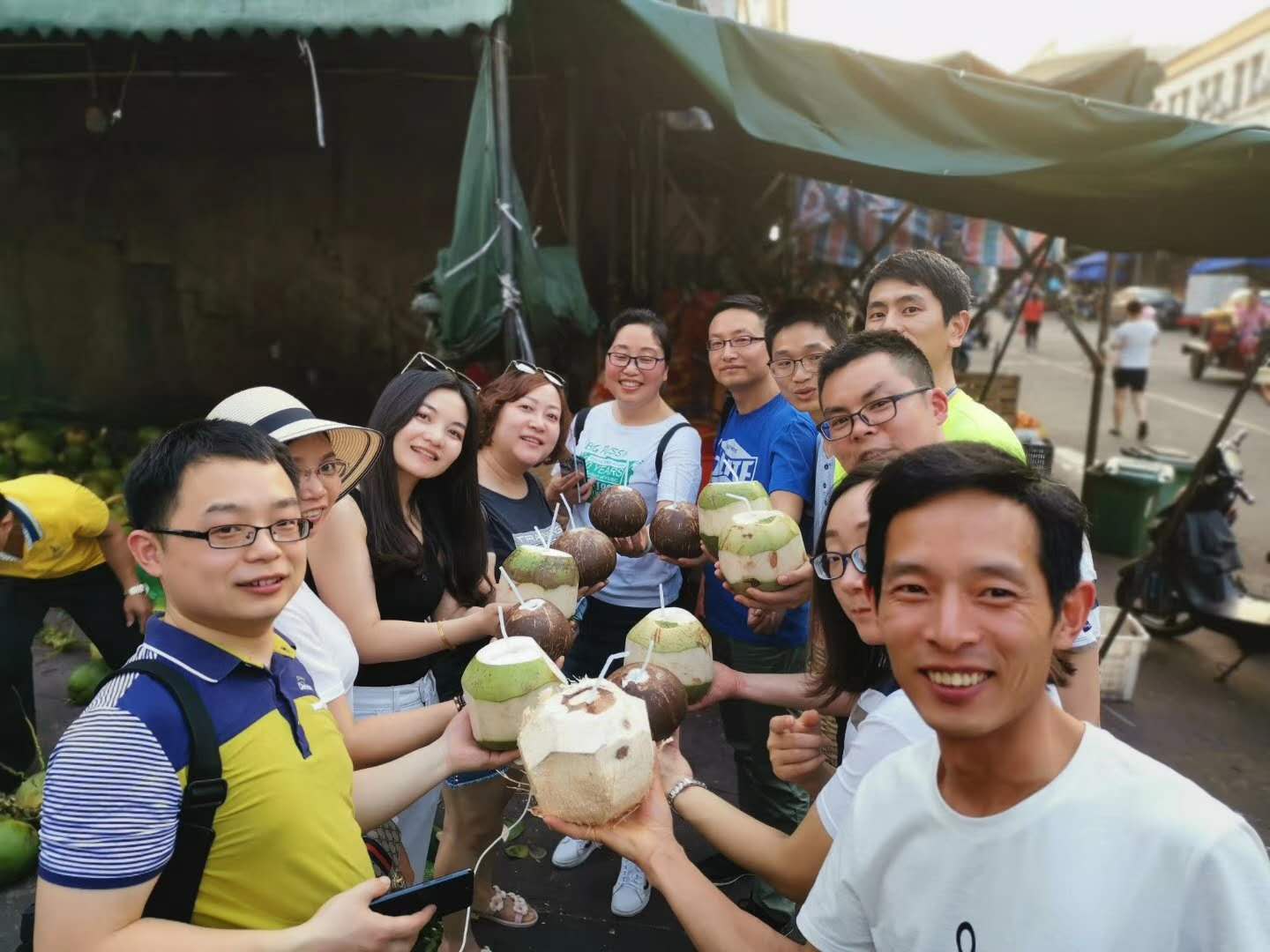 抵達(dá)酒店后,有些迫不及待了。下午我們一行就轉(zhuǎn)了轉(zhuǎn)周邊的集貿(mào)市場還和水果市場,來到椰城肯定少不了的就是一嘗鮮嫩甘甜可口的椰子了,當(dāng)然也學(xué)到如何選好喝的椰子的方法,青椰、紅椰、金椰,紅椰和青椰個頭差不多大,汁水充足,后者有淡淡的甜味兒,前者則微酸,冰凍過后更加美味。椰肉吃起來也是香香脆脆的,不過只有薄薄一層。挑紅椰的時候不一定非要挑大個兒的,小的有很多皮特薄,椰汁不比大的少。