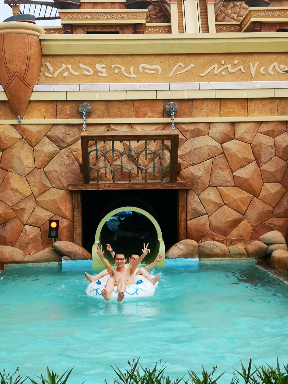 體驗了一下“海神之躍”按照安全員的示范做好準(zhǔn)備,雙臂交叉抱緊,雙腿交叉。切記,過程中不能改變姿勢。最后,慢慢往下挪,突然整個人失重,接著大腦一片空白三、四秒后,就已經(jīng)到達(dá)出口了,這幾秒很想知道自己到底經(jīng)歷了什么。立馬從泳池里爬起來找我們的小伙伴,剛才有拍到嗎,太快了而且距離太遠(yuǎn)根本拍不到。