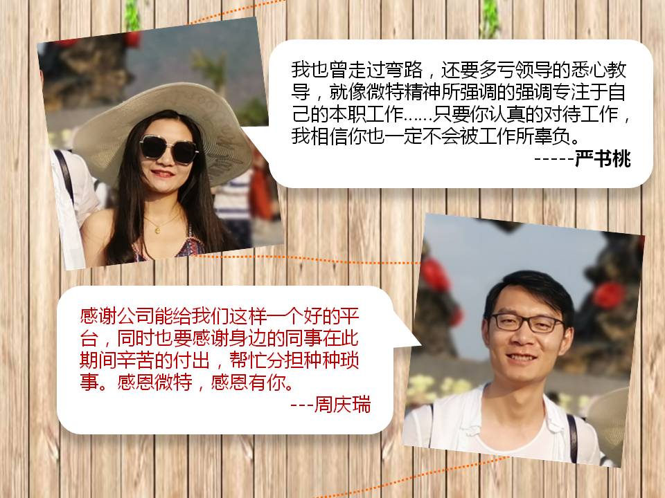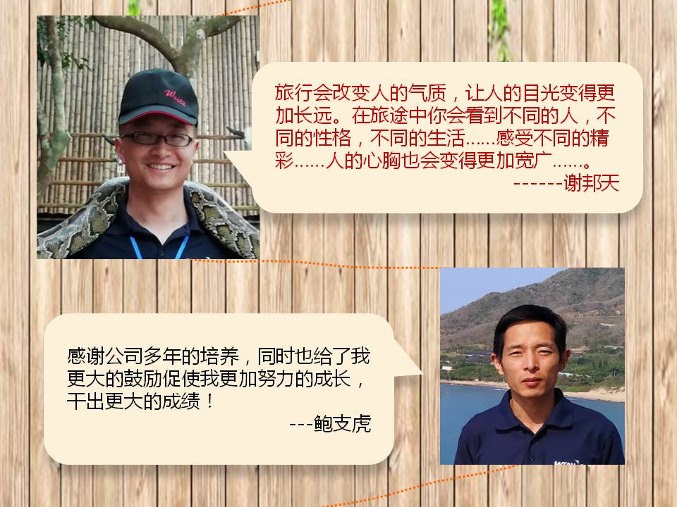 微特為2018年工作表現(xiàn)優(yōu)秀的15名員工給出了特別驚喜的獎勵-雙飛6日海南游獎勵,很有幸也很高興本次被評為優(yōu)秀員工,非常感謝公司領(lǐng)導(dǎo)的多年的培養(yǎng),同時也給了我們更大的鼓勵和激勵,促使我們更加努力更快的成長,干出更大的成就!