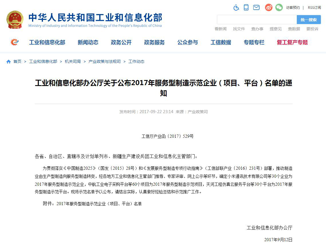 2017年9月22日,中華人民共和國工業(yè)和信息化部網站發(fā)布工信廳產業(yè)函〔2017〕529號文件《工業(yè)和信息化部辦公廳關于公布2017年服務型制造示范企業(yè)(項目、平臺)名單的通知》。