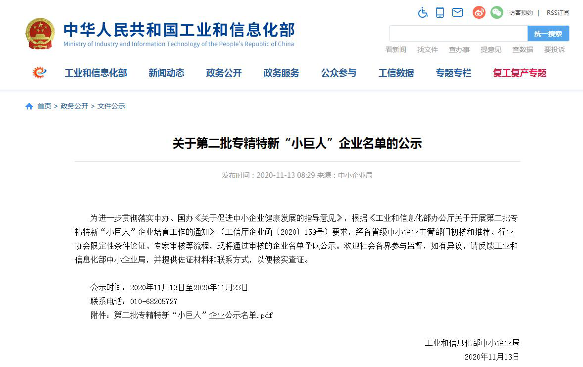 2020年11月13日,中華人民共和國工業(yè)和信息化部網站發(fā)布《關于第二批專精特新“小巨人”企業(yè)名單的公示》,微特入選第二批專精特新“小巨人”企業(yè)。