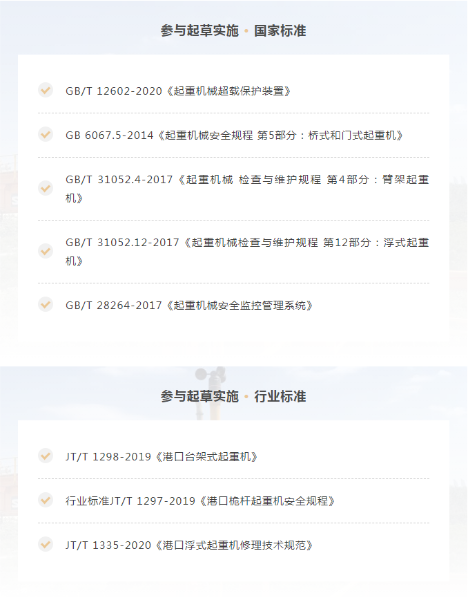 2019年9月微特當(dāng)選全國起重機(jī)標(biāo)委會臂架分會委員會委員。2020年10月1日由微特牽頭起草的國家標(biāo)準(zhǔn)GB/T 12602-2020《起重機(jī)械超載保護(hù)裝置》正式實(shí)施,這也是微特參與起草并發(fā)布實(shí)施的第5項(xiàng)國家標(biāo)準(zhǔn)。截止到目前微特先后參與了20多項(xiàng)國家標(biāo)準(zhǔn)的起草,其中5項(xiàng)國家標(biāo)準(zhǔn)3項(xiàng)行業(yè)標(biāo)準(zhǔn)已頒布實(shí)施。