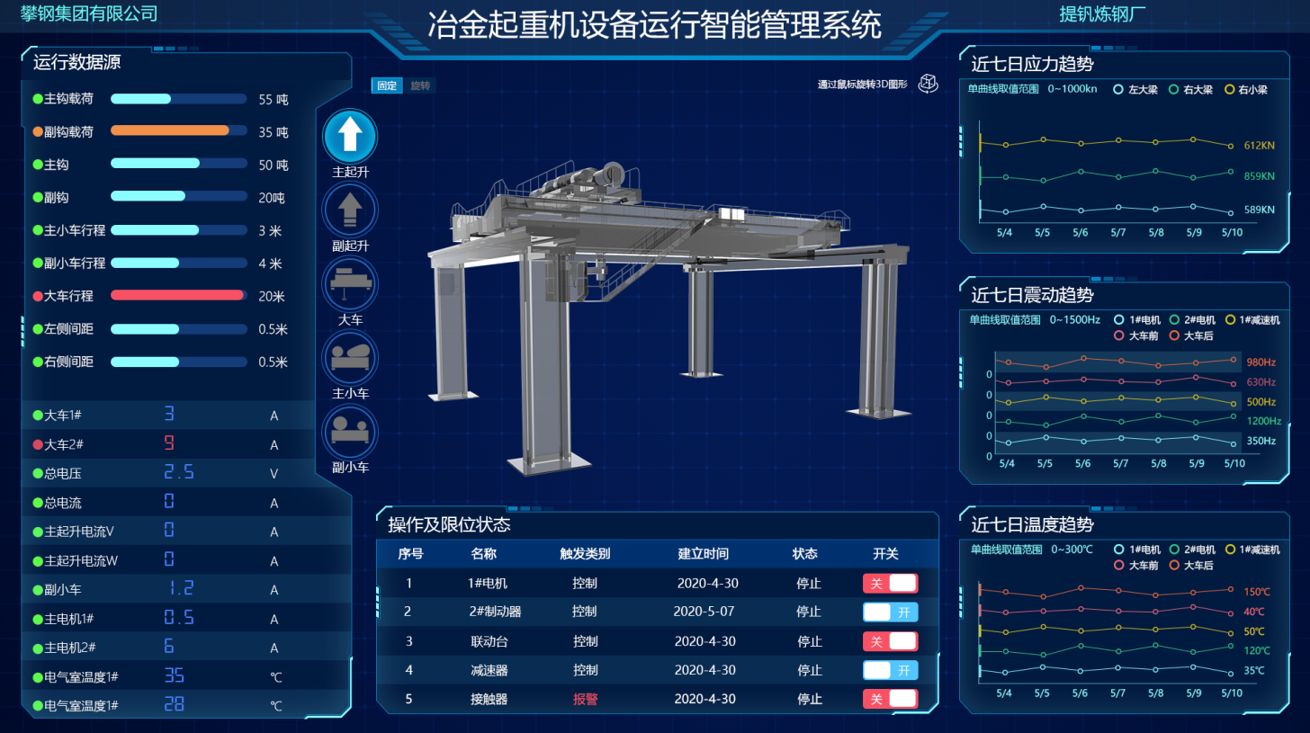 隨著5G傳輸技術(shù)的不斷發(fā)展與進(jìn)步,微特成功在湖南華菱湘潭鋼鐵為遠(yuǎn)程起重設(shè)備建立運(yùn)維診斷分析系統(tǒng),對(duì)起重設(shè)備各個(gè)核心關(guān)鍵部位實(shí)時(shí)監(jiān)測(cè),通過(guò)大數(shù)據(jù)進(jìn)行分析,讓設(shè)備開(kāi)口說(shuō)話,把故障提前排除,做到高效安全可靠運(yùn)行。